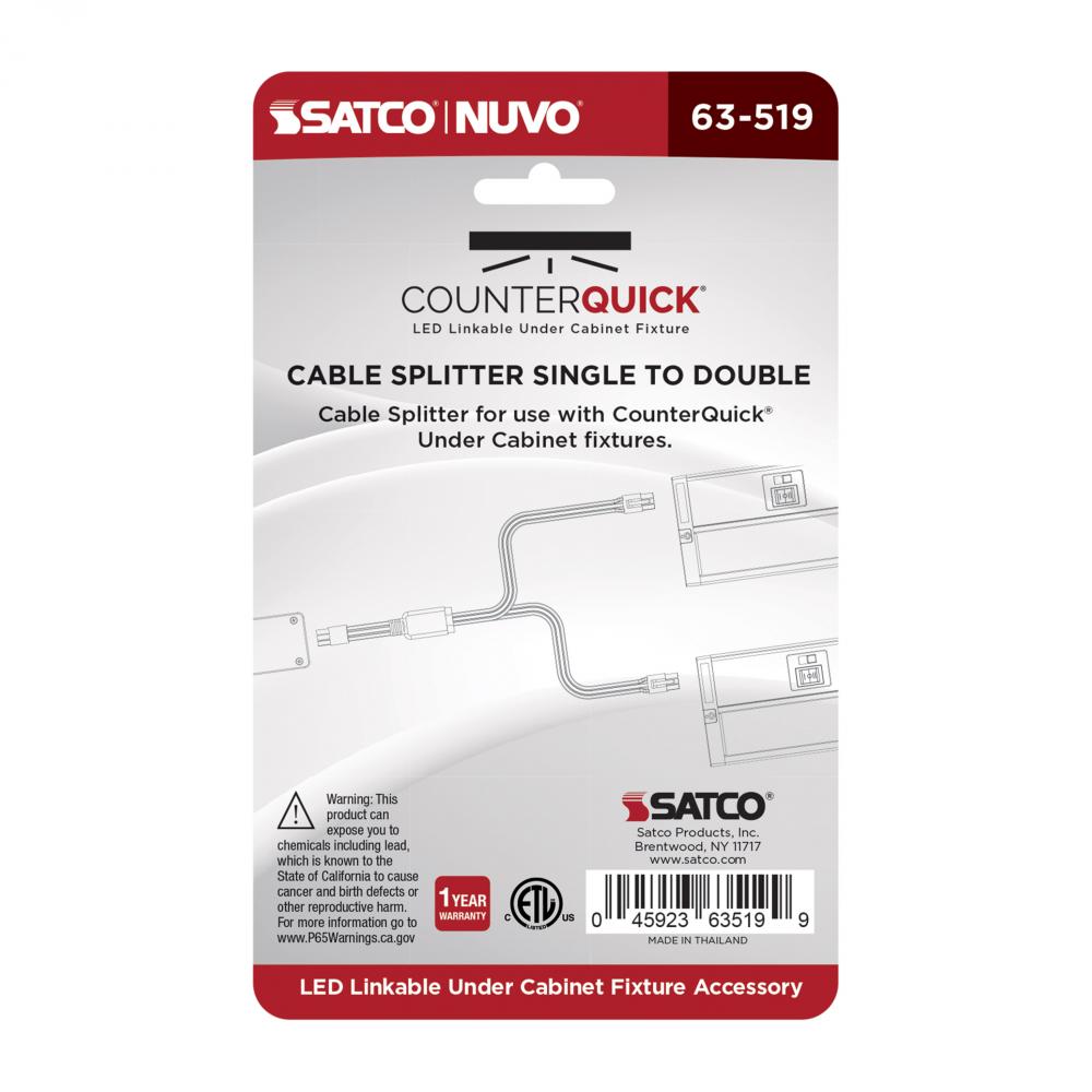 The 63-519 CounterQUICK Y-Splitter in white is used to allow multiple fixtures to be powered from a single power supply. This simplifies wiring and reduces the need for additional power sources or complex wiring configurations.