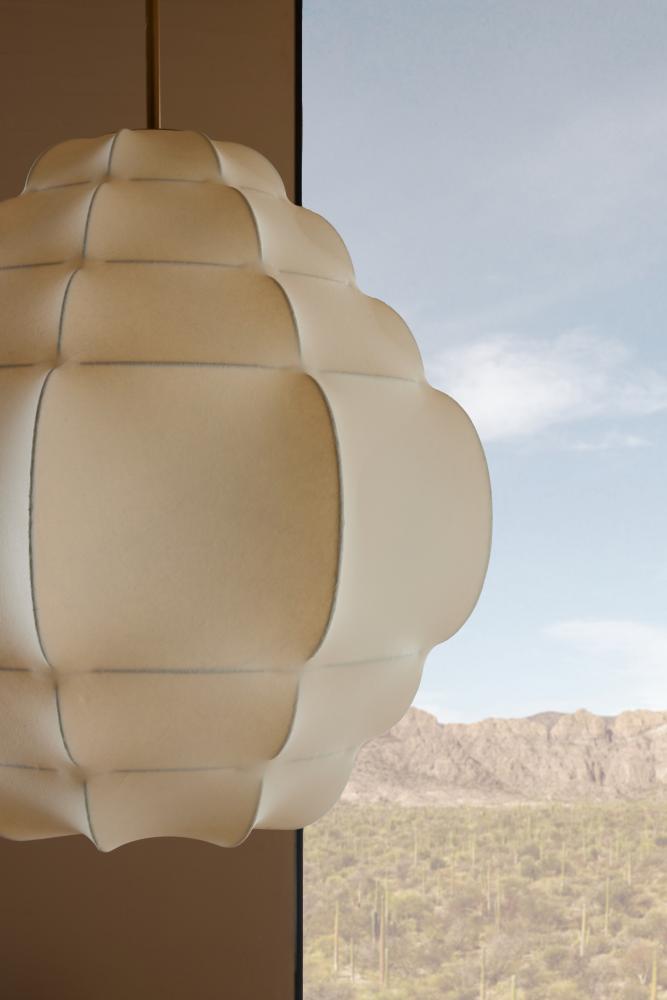 Influences ranging from the natural and modern worlds inform our Yahara. Reminiscent of a bee’s nest or Chinese lantern, this tiered design takes a steel structure finished in antique brass wrapped in a cool cocoon ofivory vegan vellum. Zen-like in its appeal, this fixture will lend a soothing glow to any space. Damp-rated, although limited covered outdoor conditions may affect finish. Finish will vary.