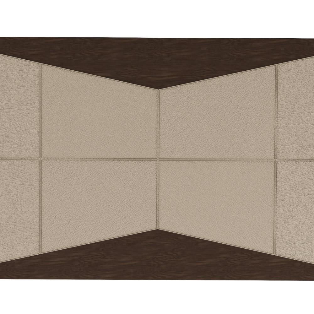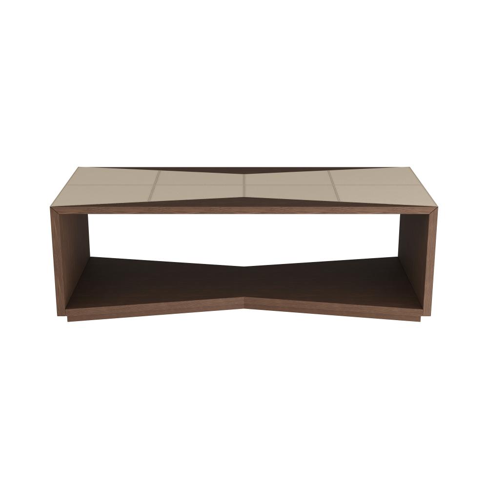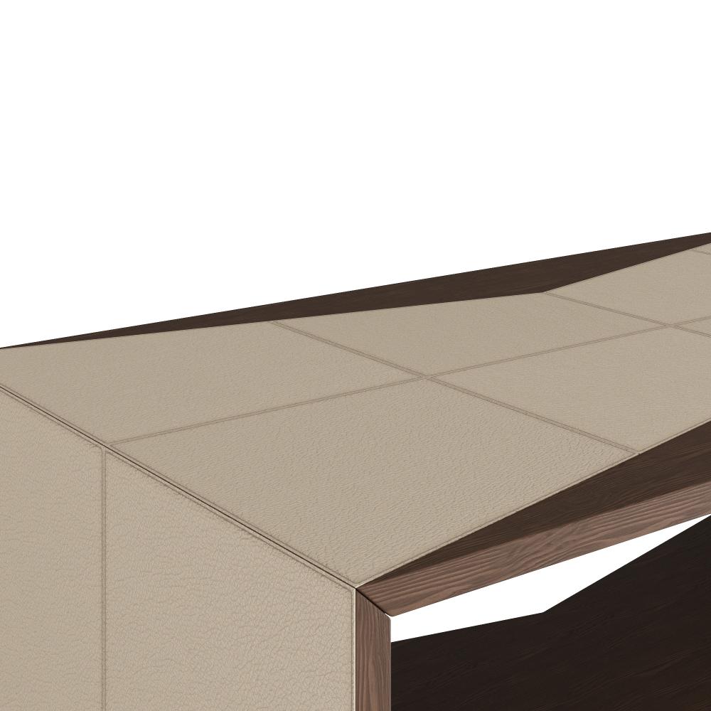 All dressed up for a cocktail hour, a "bowtie" of pebble-grained, cream ebossed leather accents the top and sides of this sculptural walnut finished oak structure. Hollow at the bottom for storage, the leather wraps the singular oak wood shelf to elegant effect. Leather and wood will vary.