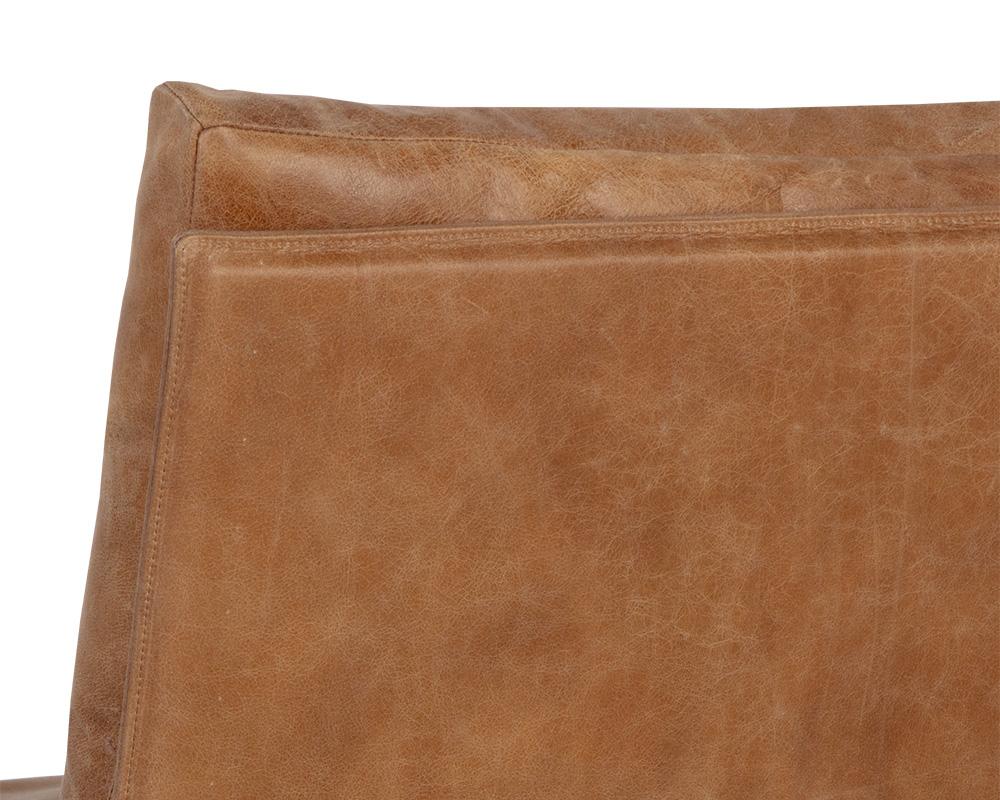 Unwind in comfort with this incredible lounge chair that features a stylish scooped seatback. Upholstered in tan leather and completed with a gunmental steel frame. Coordinating bench also available. Handle with Care: This design has been crafted with 100% genuine leather. Leather is a natural material; as such, colour variations, markings, wrinkles, grooves and light scratches are acceptable and appreciated characteristics. No two pieces are alike.
