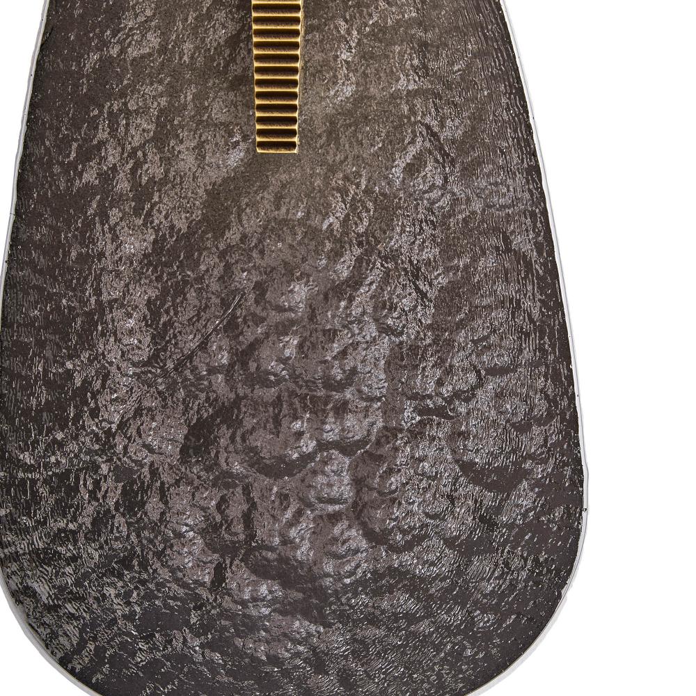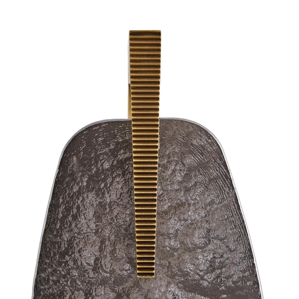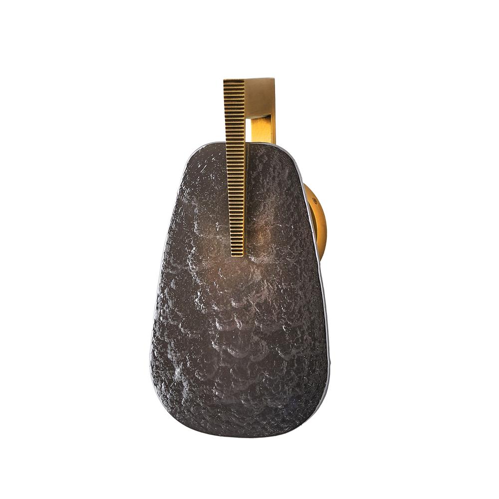 The bold geometry and decadent details of Art Deco jewelry characterize the exuberant shape of Zelda. An integrated LED is held behind the slump glass shade in smoke luster is then accented with an elegant hardware detail of antique brass iron. Damp-rated, although limited covered outdoor conditions may affect finish. Finish will vary.