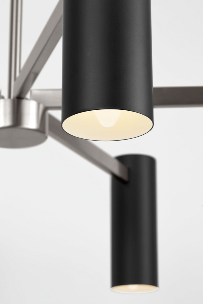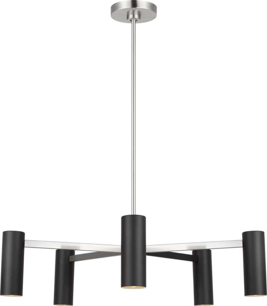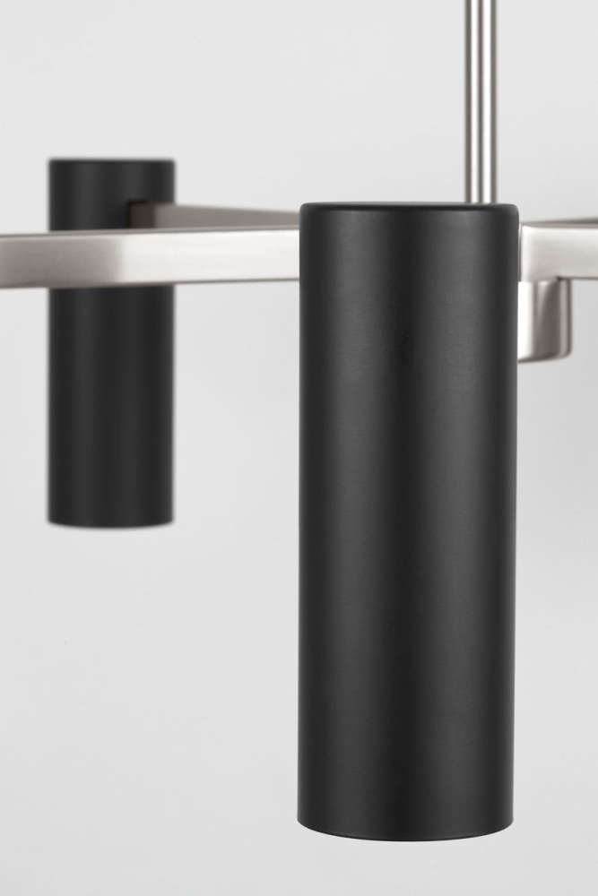 The Zentro 5-Light Chandelier features five cylindrical metal shades arranged around a central hub. with its balanced proportions and clean lines, it delivers focused downlight while maintaining an airy, open silhouette. Scaled for dining rooms, living spaces, and bedrooms, this chandelier adapts across interiors with its refined simplicity.